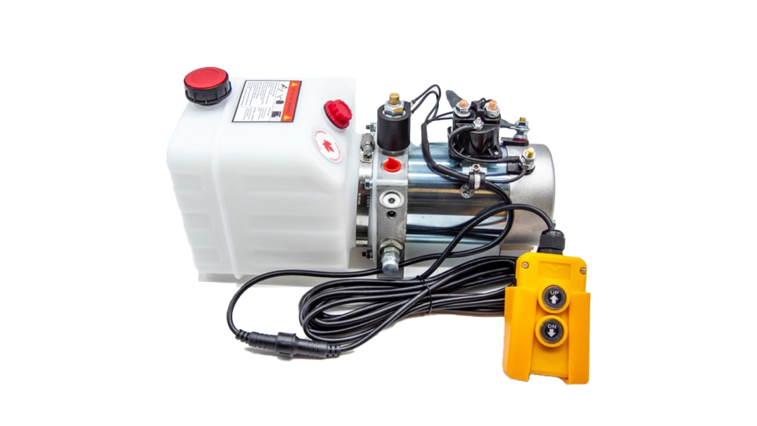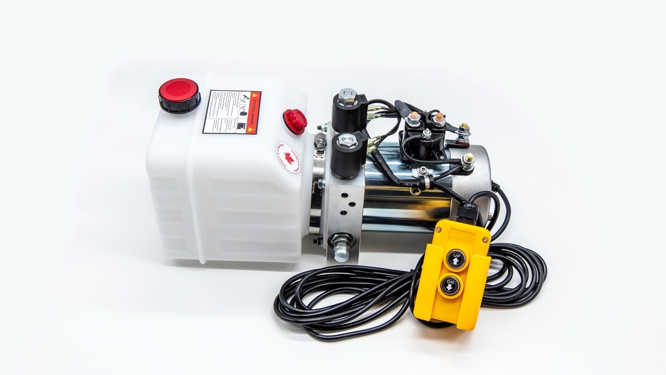 This power unit has a single acting circuit for power up and gravity down with two SAE 6 (9/16-18) ports for connecting straight or 90° hose. The 2-way, 2-position cartridge valve has a manual override and an internal check valve. This circuit also has a cartridge check valve and adjustable relief valve. The magnetic two button remote control comes with holder and 20' of cable, which has a quick connect at the motor. The gear pump is equipped with a suction screen attached to a 90° elbow inside the tank which comes with a 3/4” NPT breather/dipstick.