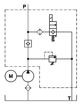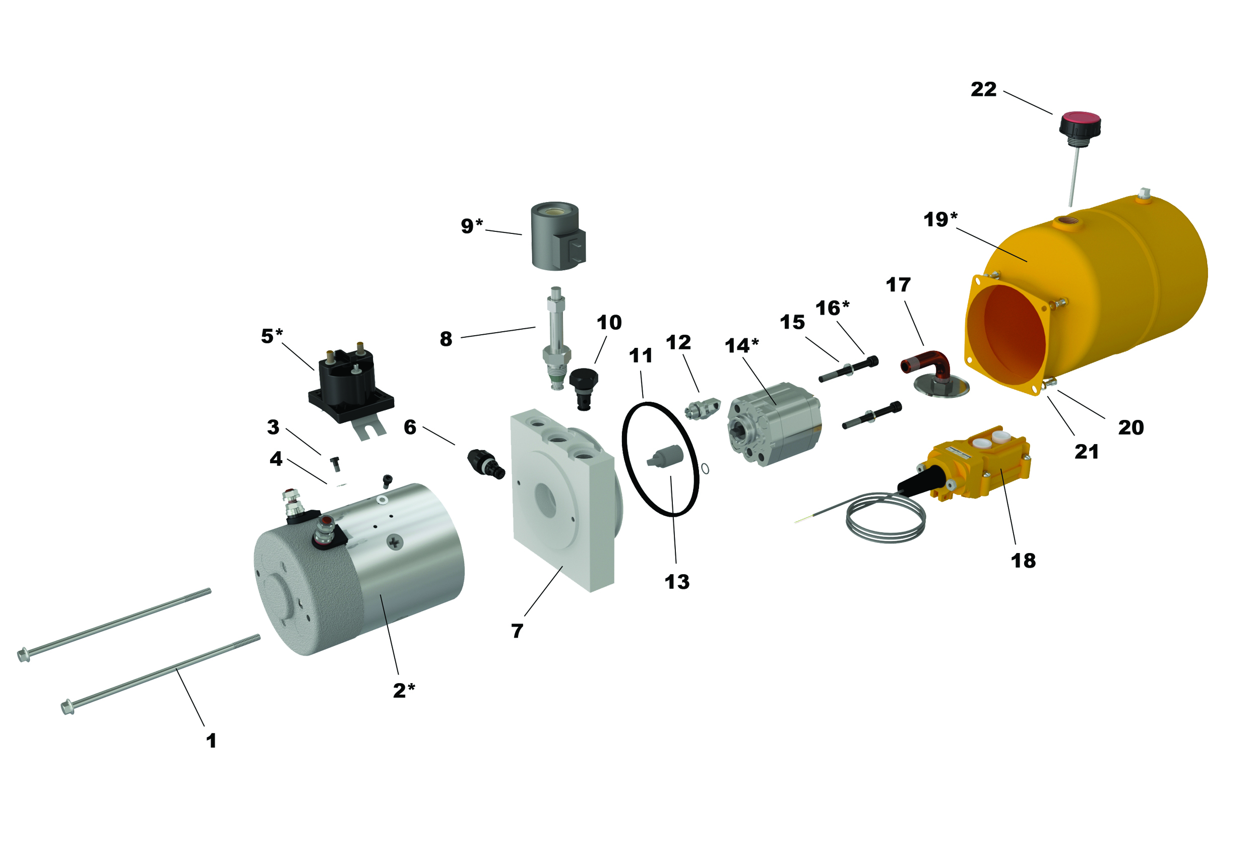 Cette unité de puissance à un circuit simple action avec deux ports SAE #6 (9-16-18) pour un branchement droit avec un boyau ou avec un coude 90°. La valve cartouche 2 positions/2 voies a une option "override" ainsi qu'un clapet interne. Ce circuit utilise une valve anti-retour et une soupape de pression. La manette de contrôle à deux boutons possède une bande magnétique ainsi qu'un boitier de support. Elle vient avec 6.0 mètre de cable et possède un branchement rapide près du moteur. La pompe à engrenage est équipée d'un grillage de succion attaché à un coude 90° à l'intérieur du réservoir. Celui-ci vient avec un bouchon-évent de 3/4" NPT.