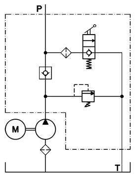 Cette unité de puissance à un circuit simple action avec deux ports SAE #6 (9-16-18) pour un branchement droit avec un boyau ou avec un coude 90°. La valve manuelle 2 positions/2 voies a un clapet interne. Ce circuit utilise une valve anti-retour et une soupape de pression. La pompe à engrenage est équipée d'un grillage de succion attaché à un coude 90° à l'intérieur du réservoir. Celui-ci vient avec un bouchon-évent de 3/4" NPT.