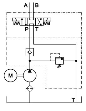 Cette unité de puissance a un circuit double action avec des ports A & B SAE#6 (9/16-18). Incluant une valve modulaire 3 positions / 4 voies (DO3) qui peut être jumelée avec d'autres option modulaires tel qu'un clapet anti-retour piloté, un contrôleur de débit ou même une soupape de pression. Ce circuit utilise une valve anti-retour et une soupape de pression ajustable. La manette de contrôle à deux boutons possède une bande magnétique ainsi qu'un boitier de support. Elle vient avec 6.0 mètre de cable et possède un branchement rapide près du moteur. La pompe à engrenage est équipée d'un grillage de succion attaché à un coude 90° à l'intérieur du réservoir. Celui-ci vient avec un bouchon-évent de 3/4" NPT.